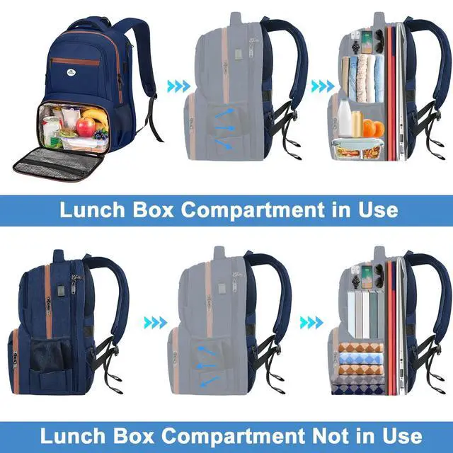 Insulated Cooler Compartment: Dimension of the lunch box compartment: 11.4 x 5.5 x 6.9 inches (hold up 10 cans / 3 L lunch box). It is made of water-resistant aluminum and high-quality lining material to not only keep the food warm but also keep drinks cold about 3-5 hours (use ice pack can keep cool better). Also the foldable lunch layer ensures food safety. Please note that when the lunch area is full, the available space for other things in the men backpack will be correspondingly reduced ^^
