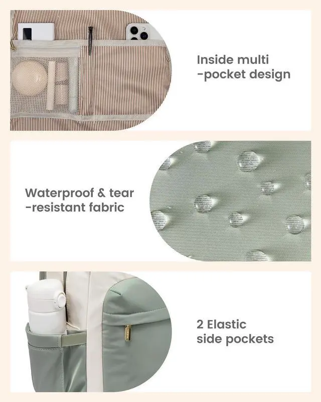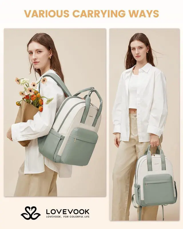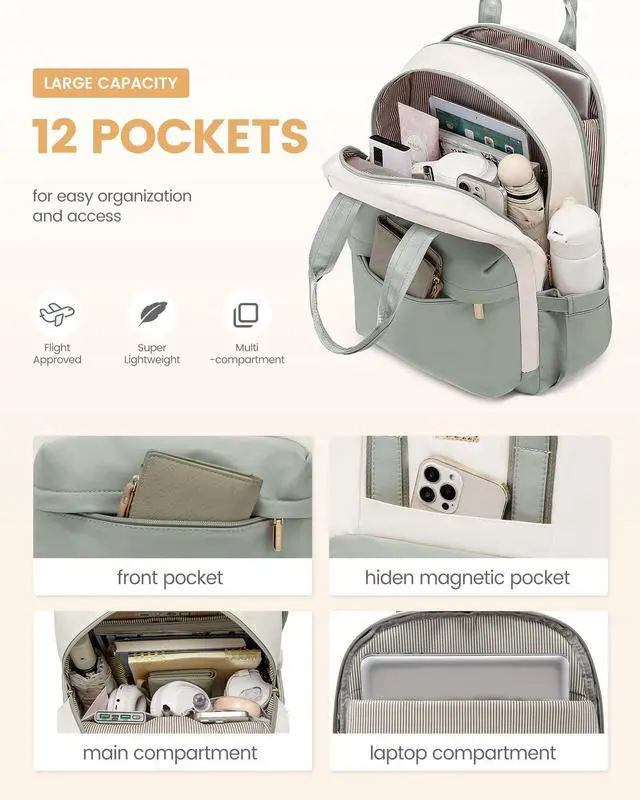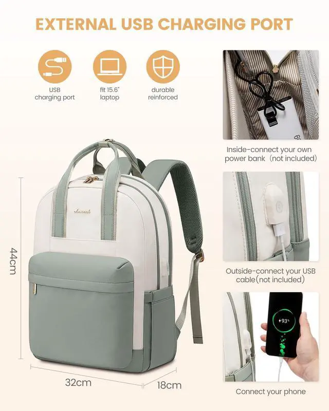 LARGE CAPACITY & ORGANIZED Size: 18.2" * 14.1" * 7.1", weight: 1.73 lb. This cute backpack for women boasts 6 organized compartments, including 1 laptop compartment, 1 main compartment, 2 front pockets, and 2 side pockets for up to 15.6" laptop, Pad, notebooks, clothes, bottle, umbrella, and more. ^^ STURDY & WATER-RESISTANT Our laptop backpack women is made of high-density polyester, scratch-proof, tear-resistant, and water-resistant. Double carry handles are reinforced seam, absolutely strong and durable, while metal double-way SAB zippers allow for easy opening/closing. ^^ USB & ANTI-THEFT Designed with great technology, which is convenient to charge your phone on the go with our USB port. Keep your phone & valuables safe in the back security pocket, preventing theft. ^^ CONVENIENT FOR TRAVEL Secure our womens travel backpack to your suitcase with the luggage strap. Perfect for plane trips and business travel to keep your hands free. (Allow to throw the commuter back pack under your seat on an airplane. ) ^^ COMFY & BREATHABLE Stay comfortable with our mesh airflow shoulder straps. Ergonomic shoulder strap length and adjustable padded straps provide maximum back support.