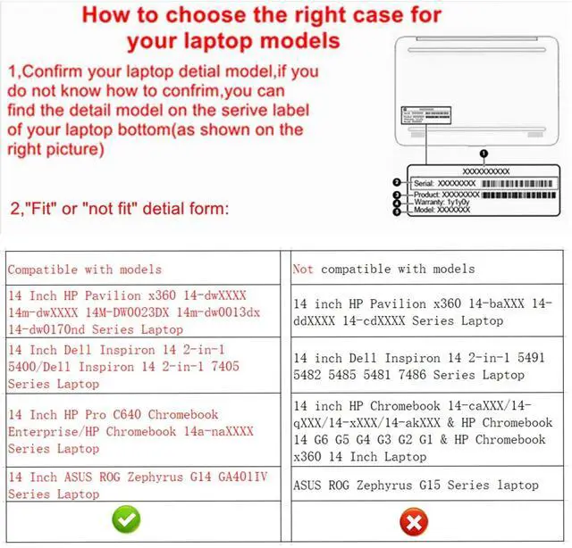 ^^ Warning: NOT compatible with 14 inch HP Pavilion x360 14-baXXX 14-ddXXXX 14-cdXXXX Laptop and 14 inch Dell Inspiron 14 2-in-1 5491 5482 5485 5481 7486 Laptop and HP Chromebook 14-caXXX/14-qXXX/14-xXXX/14-akXXX & HP Chromebook x360 14-daXXXX/HP Chromebook x360 14 G1 and Lenovo ThinkPad E14 1ST gen and ACER SWIFT 3 SF314-57 SF314-56 SF314-55 SF314-54 SF314-53 SF314-52 Laptop{{Warning: Most of returned because of choosing wrong model, please confrim your laptop model}}. ^^ This protective cover is made of the high-quality PU leather, characterized by the beautiful appearance and fine hand feeling; the inner-layer soft cashmere can better protect the laptop. ^^ Unique design with two elastic rubber bands could solve the problem of loose cover effectively in the process of using laptop (This case not support "Tablet model"). ^^ Unique liner design for laptop cooling, this case do not affect the heat dissipation of the laptop. Our store have 500+ laptop models cases, search more laptop models's case, please search "Alapmk + your laptop model".