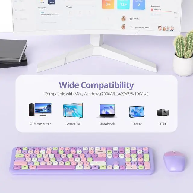 Mouse Wireless Combo: With a smooth matte surface, this soft touch keyboard is lightweight and skin-friendly, providing great hand-feeling and comfort. The ultra-thin keyboard is designed to maintain an optimum angle, and the mouse features a curved surface for correct posture ^^ Universal CompatibilityThis pretty full keyboard wireless is compatible with windows XP/Vista/7/8/10/X and other operating systems. The quiet keyboard and mouse suitable for desktop, Chrome-book, PC, laptop, computer, etc.