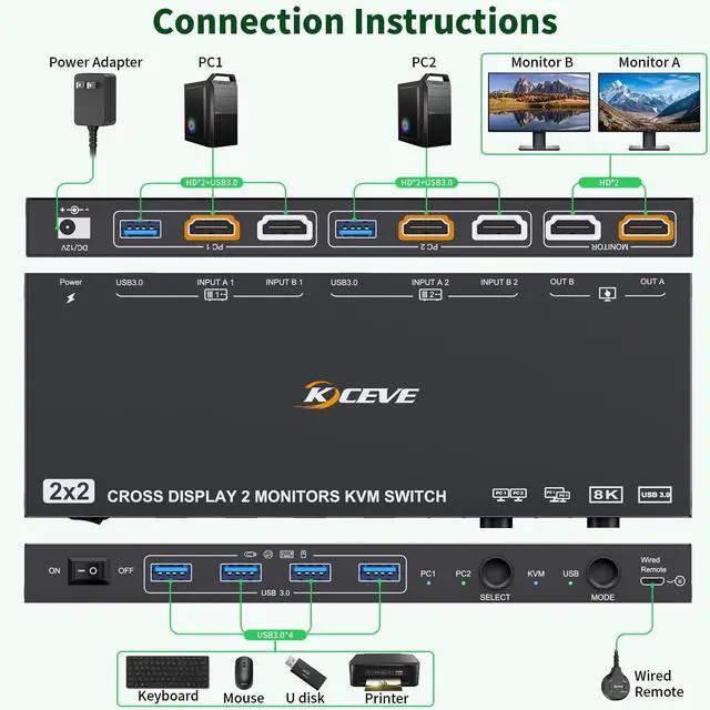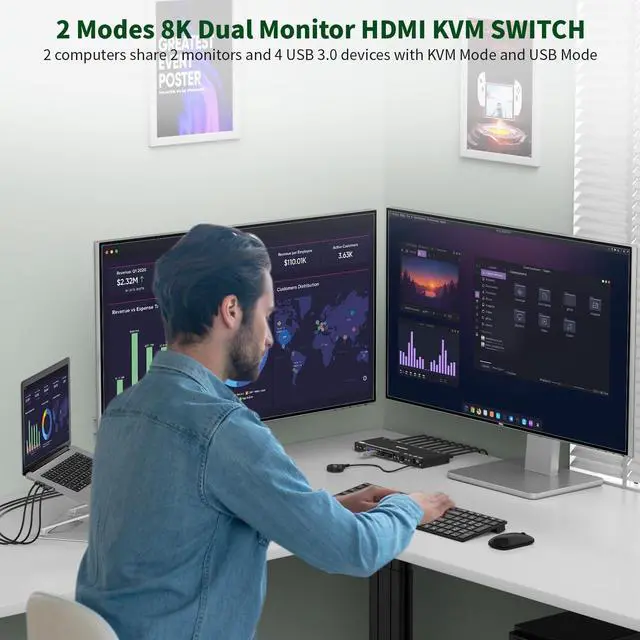 USB Mode: Each monitor shows a different computer while sharing USB devices. Monitor Switch for 2 Computers makes you switch modes instantly. ^^ 8K HDMI ClarityKVM Switch Dual Monitor supports up to 8K@60Hz/4K@120Hz for immersive work or entertainment.