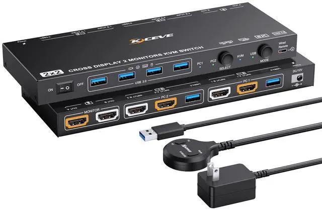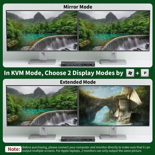 Smart Dual-Mode FlexibilityKVM Mode: 2 monitors display one computers screen (use Win+P for Mirror/Extended mode).