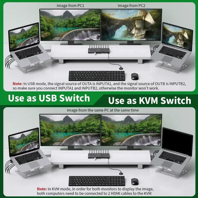 KVM/USB Mode HDMI KVM SwitchNewly upgraded! Share 2 monitors and 4 USB devices between 2 computers. Freely choose KVM or USB modeno longer locked to one function. Dual monitor KVM switch let you enjoy both efficiency and versatility. ^^