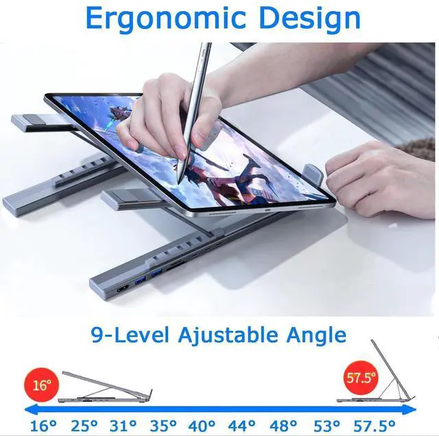 (Please note: please ensure the USB C port for your laptop supports DisplayPort Alt-mode before purchase. ) ^^ The portable laptop dock stand with 2*USB- A ports supports data transfer speed up to 5 Gbps, allowing you to transfer files quickly. Also connect a keyboard, mouse, U Flash drive or hard drive to your MacBook Pro, MacBook Air, Dell, and HP laptops without any lag; 1*USB-C data supports data transfer rates up to GEN1. TF card slots for superior data-storing versatility at a fast transfer speed up to 480MB/s. SD card transfer up to 25Mbps. Allows you tranfer files in seconds from your usb flash driver, usb/usb c hard disks; A PD charging port support max 100W power delivery, max 85W charge your laptop. ^^ Crafted from premium aluminum alloy, this docking station stand effortlessly supports laptops up to 40 lbs without any bounce or wobble. This USB C hub multiport adapter is compact and lightweight, it can be folded to the size of 10.5 * 2.2 * 0.9 inches and is only 0.7 lbs lightweight. And this MacBook Pro docking station stands also comes with a portable storage bag it is so perfect to carry when you have a business trip or traveling.