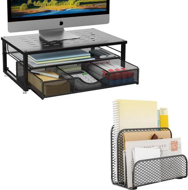 Computer Monitor Stand Riser + Mail Organizer (Black)