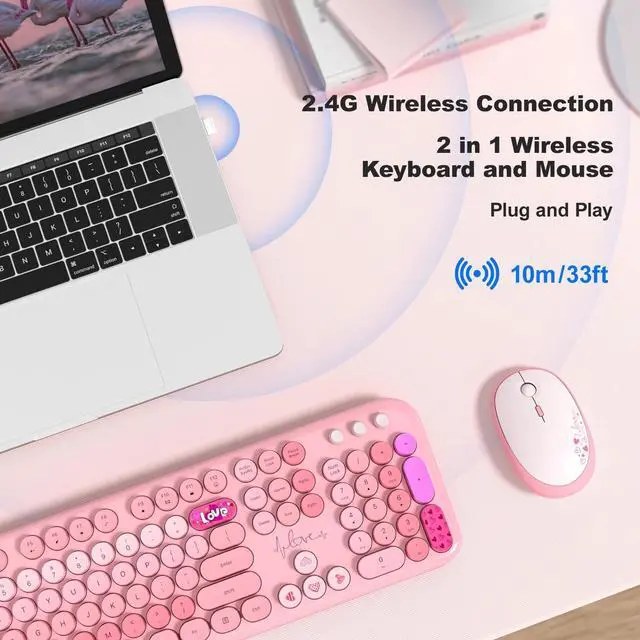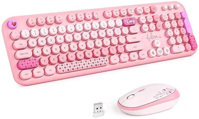 Wireless Keyboard and Mouse Combo, MOWUX Full Size Typewriter Retro Round Computer Keyboard, Cute Optical Mouse Wireless, Plug and Play, for Laptop, PC, Computer- Pink Heart