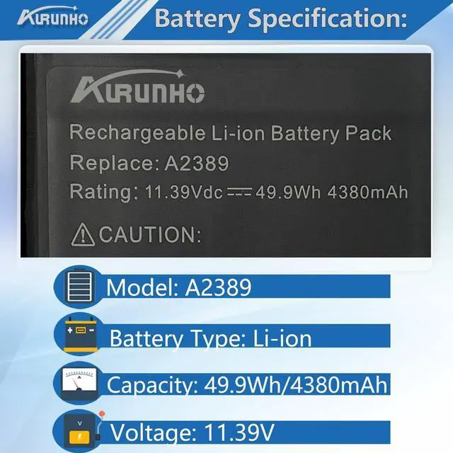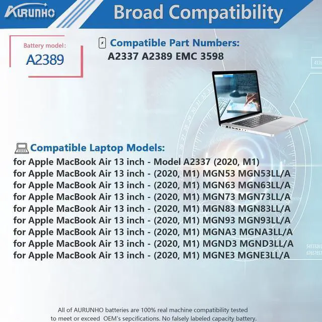 Color: Black. 100% brand New from Manufacturer. ^^ Fits Models for MacBook Air 13 inch - Model A2337 (2020, M1). for MacBook Air 13 inch - (2020, M1) MGN53 MGN53LL/A MGN63 MGN63LL/A MGN73 MGN73LL/A MGN83 MGN83LL/A MGNA3 MGNA3LL/A MGND3 MGND3LL/A MGNE3 MGNE3LL/A. ^^ Compatible P/N A2337 A2389 EMC 3598 ^^ SecurityALL of our battery is CE, FCC, RoHS Certified. And have passed a series tests of short circuit, overheating, and overload protection before shipments for safety. ^^ AURUNHO After-sales We guarantee 30 days money-back and 12-month warranty; 24 x 7 email support. For any battery questions you fell free to contact us via "Your Orders" tab in your account, we will be glad to help you within 24 hours.