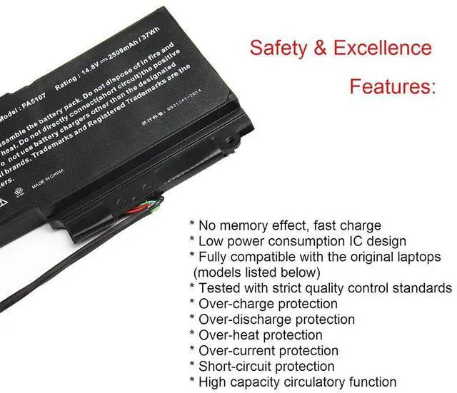 Compatible Part Numbers: PA5107U-1BRS P000573230 P000573240 PA5107U-1BAS; Toshiba Satellite L45 L45D L50 L55 L55D L55T P50 P55 P50-A P50t-B S55 S55T S55-A5294 S50-A-115 S50- A-K1M S50-A-K7M S50-A-X0010 S50-A-113 Series ^^ This laptop Battery works with Toshiba Satellite S55-5188 S55-5239 S55-A5167 S55-A5169 S55-A5176 S55-A5188 S55-A5197 S55-A5235 S55-A5236 S55-A5275 S55-A5279 S55-A5290 S55-A5294 S55-A5295 S55-A5335 S55-A5359 S55-A5364 S55-A5383 S55-B5280 S55-b5292 S55-C5274; S55t-A5334 S55T-A-5237 S55t-A5389 S55t-A5277 S55t-A5258NR; L55t-Aa5290 L55-B5294 L55T-A5186 L55-A5226 L55-A5284 L55-A5294; P50-a P50t-a01c P55T-B5360 P55-A5200 P55-A5312 P55T-A5116 P55t-A5118 P55t-A5202 P55t-B5262 ^^ 100% New from Manufacturer, Overcharger and Discharger Circuit Protection, CE-/FCC-/RoHS-Certified for safety; Grade A cells ensure fast charges and low power consumption; Built-in circuit protection ensures both safety and stability ^^