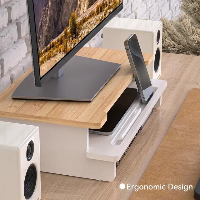 Ergonomic Design for Healthier Work Habit The monitor stand riser elevates your monitor 5 to eye level, promoting proper posture and helping reduce neck, shoulder, and back strain during long work hoursperfect for home offices and workspace ^^ Stable, Space-Saving Base4 Non-slip feet provide excellent grip on any desktop surface, preventing scratches and wobbling, while the compact footprint ( 16.54 x 10.63 x 5) maximizes desk efficiency ^^ Built to Last with Premium Materials Crafted from natural bamboo and high-density MDF panel, this monitor riser offers a sleek, modern look while supporting up to 110 lbsideal for monitors, all-in-one PCs, or heavy displays ^^ Smart Storage & Cable Management Integrated phone and tablet holder keeps your devices secure and within reach, while the spacious platform of the computer stand helps declutter your desk, creating a clean, organized workspace ^^ Safe & User-Friendly Design Smooth rounded corners prevent accidental bumps, and the tool-free assembly ensures quick and easy setupno hassle, no frustration ^^ Customer SupportAny questions, problems & recommendation is welcome.