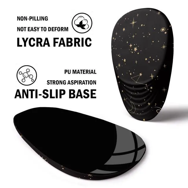 The covering is the smooth fabric, high-quality Lycra cloth and high-definition bright print pattern on the surface, which won't irritate to skin. Its hard to curl up on the edges even after long time usage because the fabric stays with the PU material base tightly. ^^ Powerful Function It is divided into two areas of different sizes: mouse operation area and arm support area, you can move the mouse more easily and at the same time, you can make the wrist evenly and tightly fit, reduce wrist pressure and avoid carpal tunnel syndrome. ^^ Usage scenarios The Non-slip Base make the mouse pad firmly fixed on any desktop. The PU material base is hard enough for you to use the mouse pad on any other places.