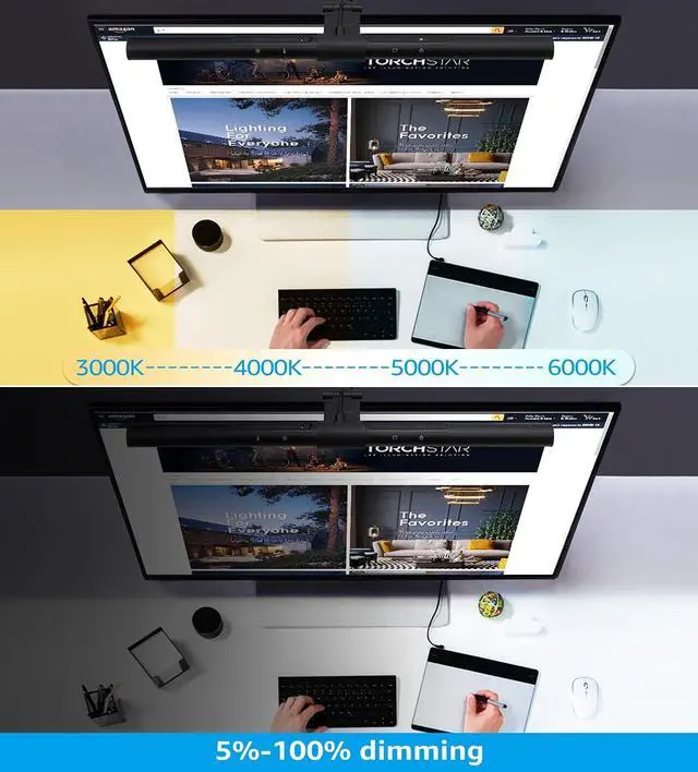 Screen Glare: High CRI97 restores the real color of the objects. Its asymmetrical optical design plus adjustable light angle effectively avoids reflective glare off the screen, creating non-flickering, more comfortable and eye-healthy environment with no light pollution ^^ 4-Level Dimming & 4