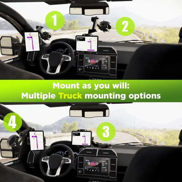 - - Features a 3-point arm iPad holder for truck and a durable clamp that keeps your device tightened, within easy reach, and ready for any route. ^^ & - 16.7 -inch arm tablet holder for truck with durable, temperature-resistant materials and a spring-loaded mechanism to hold your device firmly in place. ^^ - - Heavy duty tablet mount with an advanced vacuum gel base + suction power that grips tight in any condition. It stays locked in place, keeps your device steady, and gives you complete control like a true king of the road.
