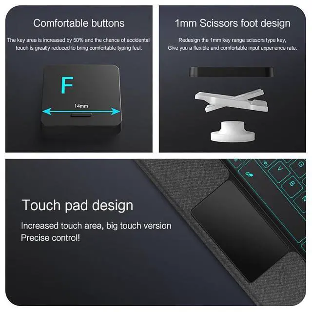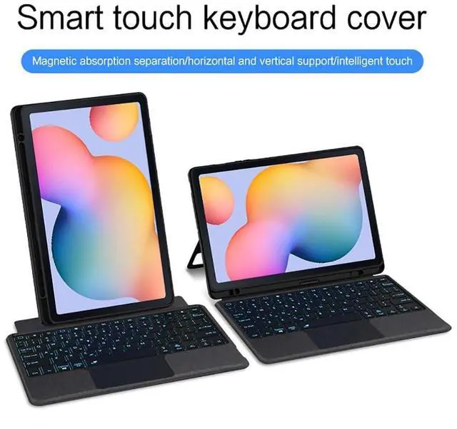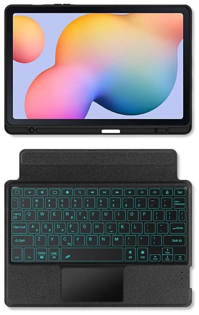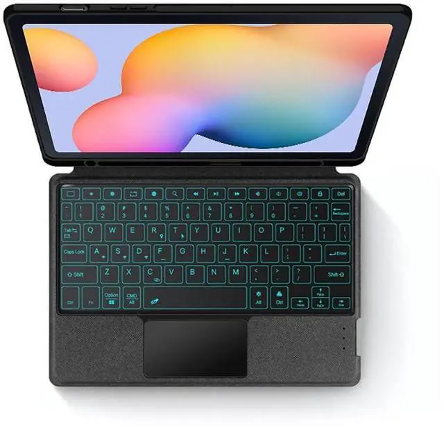 ^^ 7 Colors Backlight KeyboardThis Galaxy Tab S6 Lite keyboard has seven backlight colors and three brightness levels. The seven backlight colors are beautiful, the three brightness models make you comfortable to type in the dark. Not only protect your eyes, but also could improve work efficiency. The full-size keycaps, function keys make you get the PC feeling type experience. ^^ Built-in TrackpadThe wireless keyboard built-in touchpad for easy scrolling, which support multi-finger function will offer a great aid when you do not have a mouse in hand, allows you to use it like a laptop, very convenient.