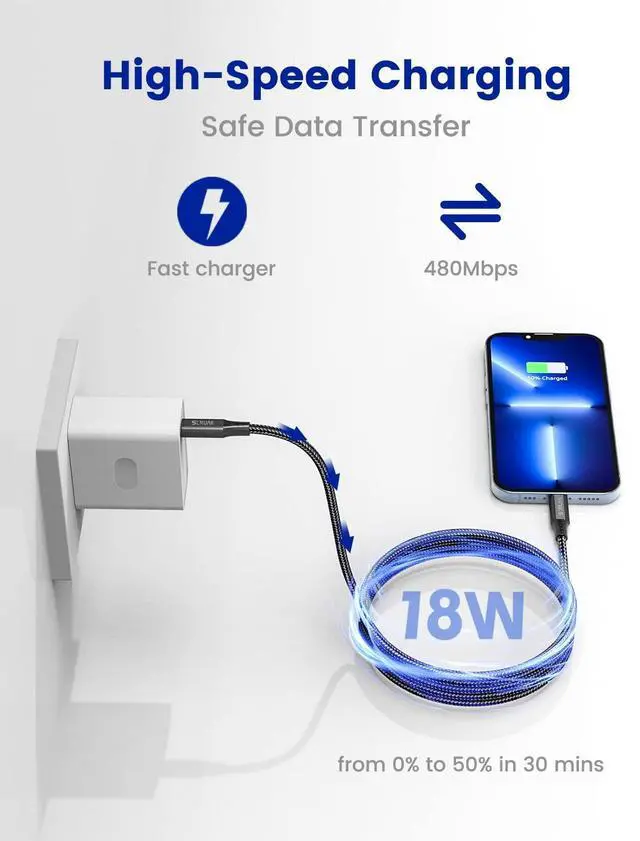 Fast Charge and Data TransferThis iPhone 14 charger cord supports power delivery fast charge (iPhone 13 from 0% to 50% in 30 minutes), and meanwhile, keeps your device safe. And the 16ft iPhone charging cable also supports data transmission up to 480Mbps, efficiently transferring music, files, pictures and videos in short time.