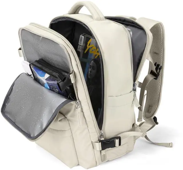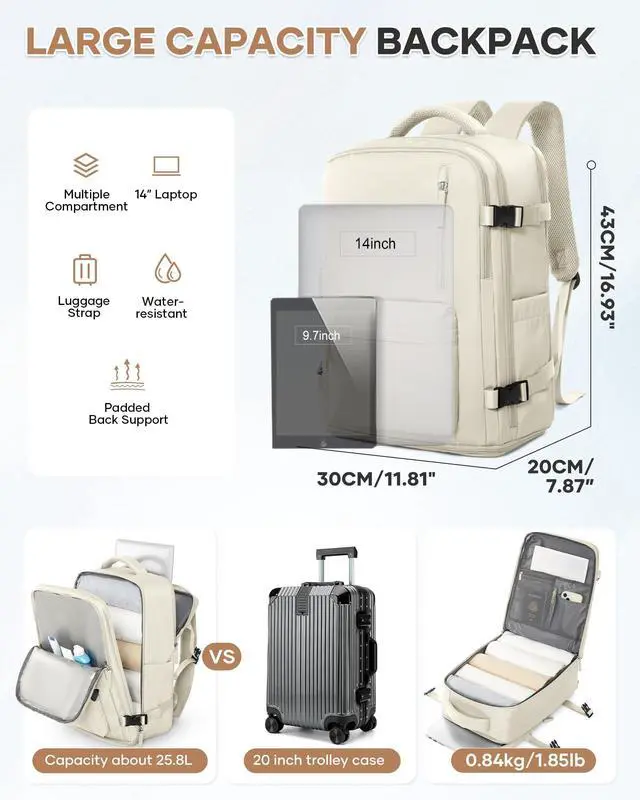 Great travel backpack for women This backpack is made of durable waterproof polyester, good air permeability and heat dissipation with two padded shoulder straps, offers lightweight carrying and strength reinforcement, relieve shoulder pressure, and maintain cool when wearing for a long time. And it's hard, solid, and doesn't fade. ^^ Separate Shoe Compartment Design & Wet Bag Main pocket x 2, laptop compartment x 2 (suitable for 13 "tablet and 14" laptop respectively), The wet bag is made of high density water resistant material can help you to separate dry items and wet items, if you have wet clothes or towel, you can put it in the wet bag.