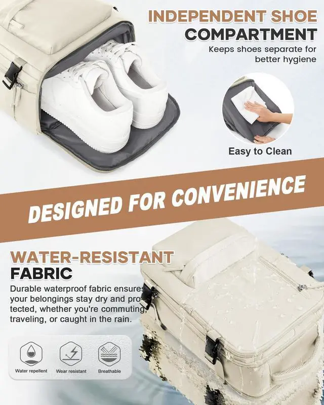 A separate shoe compartment can help you carry and keep your shoes better in your travel bag. ^^ Applicable ScenariosWhen you are on daily commute, you can easily organize your computer and files; when you are on outdoor adventure, the waterproof and breathable design can cope with bad weather. Whether you are traveling in the city or exploring in nature, it is the ideal choice for you. ^^ Professional Sleek LookStreamlined silhouette with clean lines and subtle branding, designed to complement business attire while maintaining functionality. The understated elegance transitions seamlessly from airport to boardroom, with a structured shape that keeps its form even when packed full.