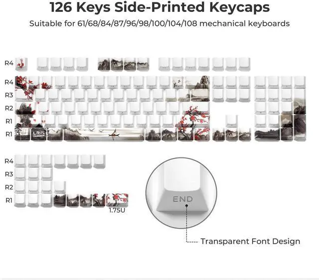 (Note: The side print keycap is more suitable for keyboards with LED facing south. ) ^^ Durable Dye Sub Keyboard Key caps Made of textured, high-grade 5-sided dye-sub PBT for a more durable finish less prone to long-term, shiny grime buildup, these keyboard keycaps provide top-notch durability and comfortable experience of typing to you. ^^ Cherry Profile Double Shot KeycapsThe keycap set designed with the classic Cherry profile, engineered for the ultimate typing experience. You won't get tired even if you use it for a long time at work or gaming. ^^ Widely CompatibleThis shine through keycap set contains 128 keys. it can fit most 60%/65%/75%/80%/96%/100% (61/64/68/84/75/87/96/980/104/108) keyboards. ^^ What You Get1x136 custom keycap set (key puller included), our worry-free 18-month warranty, and friendly customer service. Its only keycaps, no keyboard included.