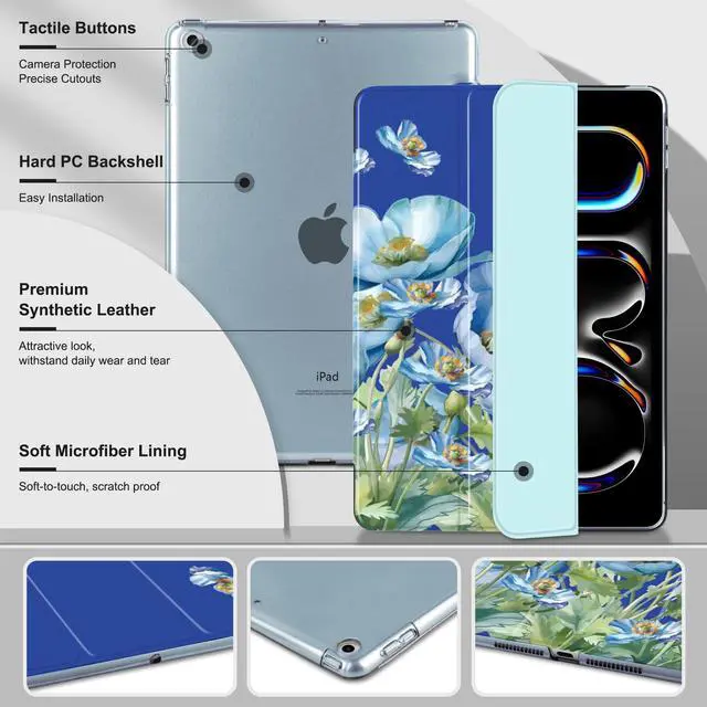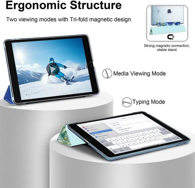 Specifically engineered for 10.2 -inch 2021 iPad 9th Generation (A2602/A2603/A2604/A2605), 2020 8th Generation (A2270/A2428/A2429/A2430), and 2019 7th Generation (A2197/A2200/A2198). Not compatible with other iPad models ^^ Magnetic protective cover automatically wakes iPad 10.2 when open and hibernates when closed to conserve power. Tri-fold stand provides the perfect viewing and typing angle ^^ The translucent frosted back cover lets you see the Apple icon in your favorite color, while the front cover combines a premium PU exterior, microfiber lining, and soft TPU for excellent scratch, impact, and drop protection to ensure long-lasting protection for the 10.2 -inch iPad ^^ Precise cutouts for all ports and buttons make it easy to access all the features of 10.2 iPad without having to remove the case too often.