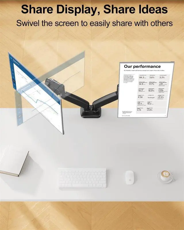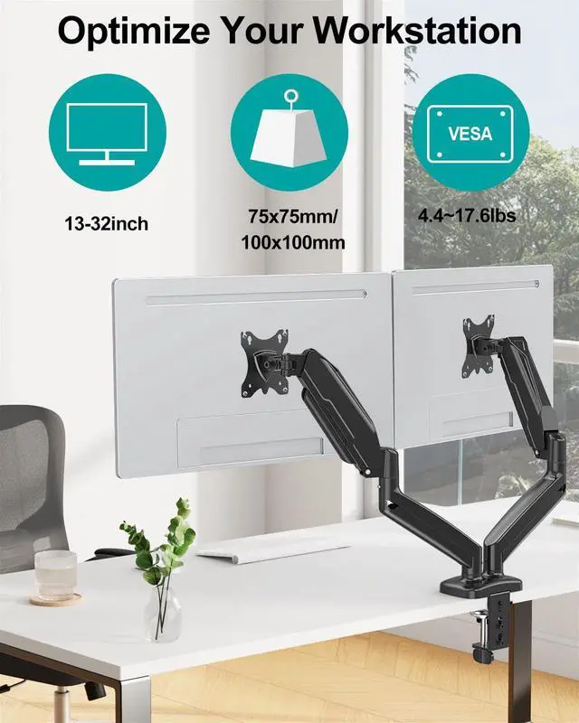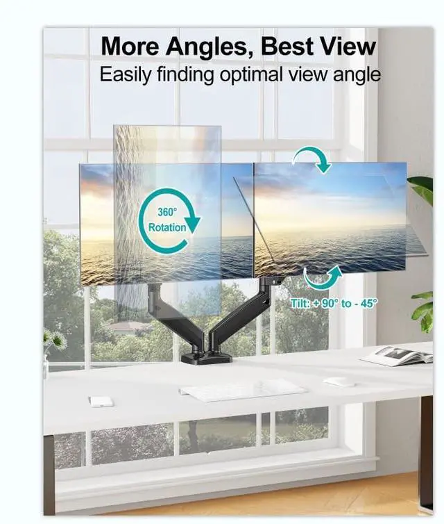 The integrated cable management system keeps your desk clutter-free from wires and cables. ^^ Consider Every Angle - Looking for a more dynamic way of working? MOUNT PRO dual monitor Desk mount is your first choice. This computer monitor mount offers +90 to -45 of monitor tilt, 180 of swivel, and 360 of rotation to maximize ergonomic comfort. The monitor arms for 2 monitors/screens are height-adjustable and can customize your monitor combination, which is more convenient and efficient for design and data analysis work. ^^ Super Compatibility - Widely fits two 13" to 32" monitors with VESA 75x75 mm or 100x100 mm mounting holes on the back, not limited to 32 30 28 27 25 24 23 22 21 20 19 17 inch screen, but not compatible with 1000R/1500R/1800R curved screens.