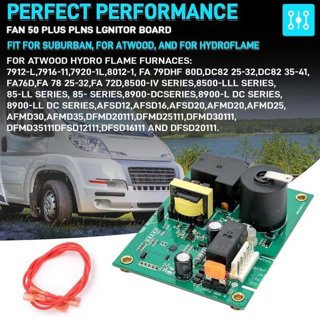 CompatibilityUpgraded Universal Ignitor Board is designed to replace the new Suburban and Atwood/HydroFlame Fan Control boards as well as maintain backward compatibility with the Fan 50 Plus and UIB Fan Control boards(1994+ models). ^^ PerformanceEnhanced efficiency for a more energy-saving device! This board can beused to upgrade older furnaces to add the Fan Control feature. In the event that the fan control ignition panel fails to detect a flame after the third ignition attempt, the fan motor will automatically shut off. This feature not only helps conserve battery power, but also prevents unnecessary cold air blowing, resulting in enhanced device efficiency.