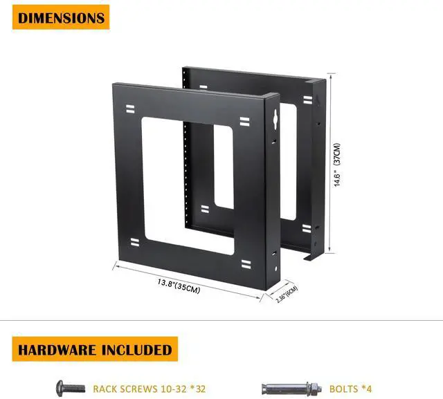 wall mount rack width: flexible; depth 13.8 (35 cm), height 14.6 (37 cm). Also other height 4U ( 7.5 ) and 6U (11) are available. Compatible with EIA-standard, the mounting rails have threaded size 12-24 holes for securing equipment to the steel frame.