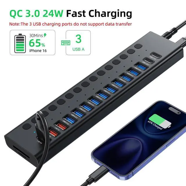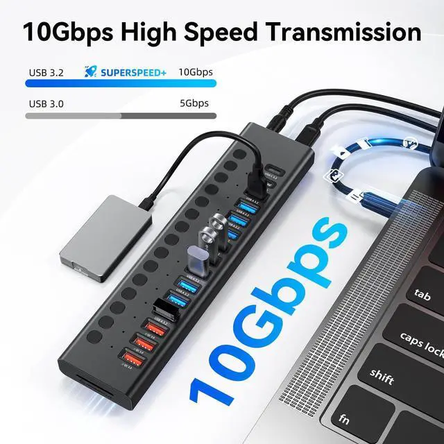 USB 3.2 Hub: VANGREE Powered USB Hub equips with 10 x USB-A 3.2 ports, 3 x USB-A QC 3.0 (24W) fast charging ports, 2 x USB-C 3.2 ports, SD/TF card reader.