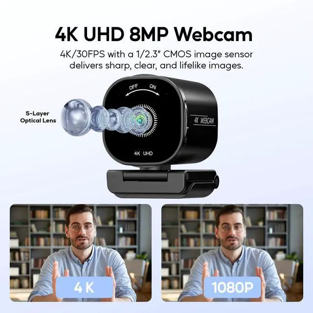Clear Audio: Say goodbye to background noise! Equipped with dual microphones and advanced noise-cancelling technology, the Holyask 4K webcam ensures your voice is heard clearly and naturally during meetings, online classes, or live gaming sessions. Ideal for busy office spaces or noisy home environments. ^^ Wide-Angle Lens & Automatic Light Adjustment: The 73 field of view provides comprehensive coverage for group calls or dynamic scenes. With automatic light correction, this streaming webcam adapts to different lighting conditions, ensuring you look your best in every situation, whether under dim or bright lights. ^^ Flexible Design with