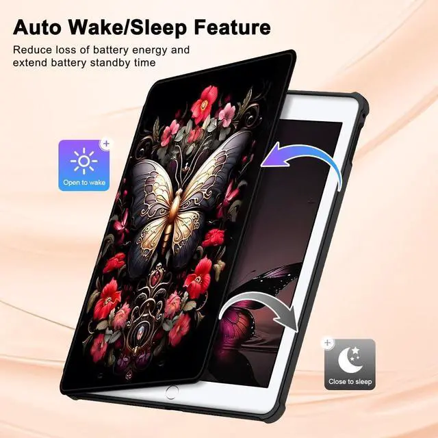 Note: The Stylus Pen is NOT included in the package. ^^ 360 Degree Rotating This case for iPad 6th/5th can swivel both vertically and horizontally, non-slip lining material and grooves can set up multiple stand angles stably to reach your most comfortable viewing or typing. Functional and convenient. ^^ Auto Sleep/Wake CoverThis is designed for iPad 6th/5th case automatically wakes or puts your tablet to sleep when the lid is opened and closed, protects and extends battery life. Easy access to all features and controls even with the case on. Precise cutouts, with all buttons and ports accessible. ^^ Unique Triple Shockproof Protection Compared with the outdated design, the unique iPad 6th/5th Case designed with an add-on bumper made by high-performing impact material. Absorbs more shock energy between the tablet and the hard back case. choose this case to express delicacy and elegance of your life style. Upgrade built-in sponge technology adds extra heat-dissipation.