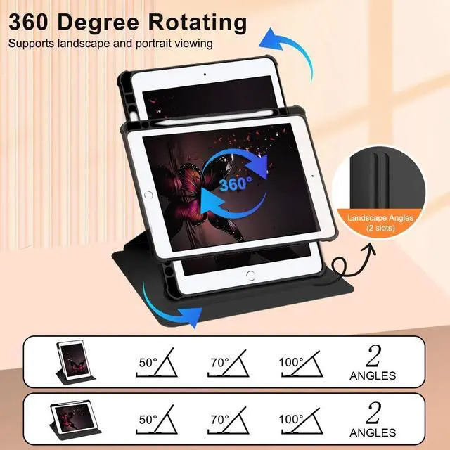 Note: Before purchasing, Please confirm the model at the bottom of the iPad. NOT fits for any other devices. ^^ Built-In Kickstand & Pencil HolderThis iPad 6th/5th case with a rotating stand that offers multiple viewing angles, allowing you to free up your hands for studying, working, or enjoying your favorite shows. Also built-in an Apple Pencil slot, storing and retrieving your stylus is simple and secure (say goodbye to the frustration of misplacing or losing your Apple Pencil).