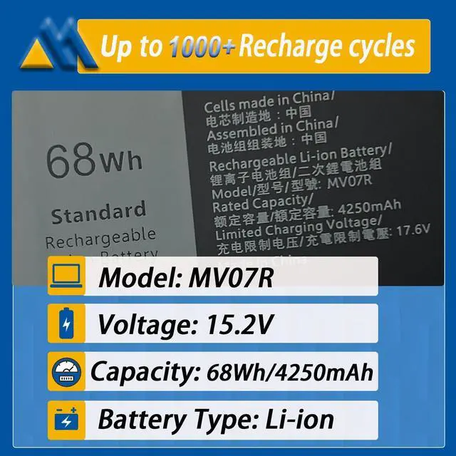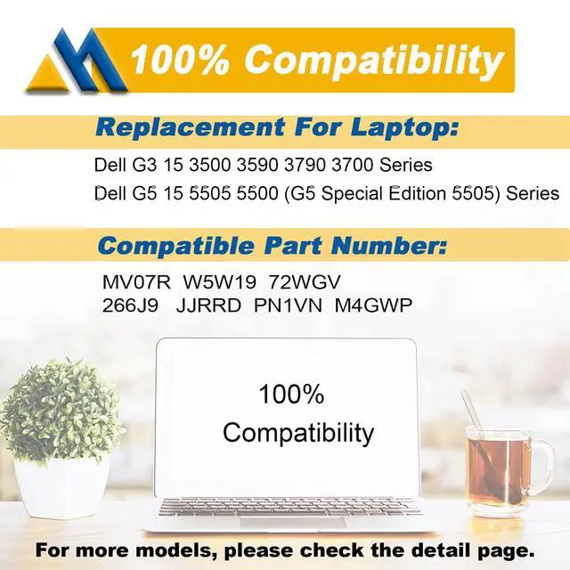 Battery type: Li-ion. (We only use grade A battery cells that provide up to 500 recharge cycles over the life of the battery. Come with screwdrivers. ) ^^ Compatible Part NumberMV07R W5W19 72WGV 266J9 JJRRD PN1VN M4GWP ^^ Replacement For Laptopfor Dell G3 15 3500 3590 3790 3700 Series, for Dell G5 15 5505 5500 (G5 Special Edition 5505) Series. ^^ SecurityAll Mobik products are certified by UL / CE / FCC / RoHS for safety. Were so confident in the performance of our replacement laptop batteries, strict guidelines for compatibility, strict quality control standards and standards compliance for environment safety. (including short circuit, overheat, and overload protections. )