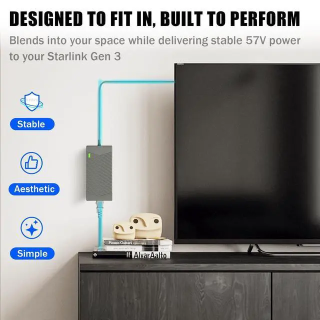 10-Foot Total Length Power Adapter for Flexible Indoor PlacementDesigned for Starlink Standard Gen 3, this integrated AC power cord enables convenient routing in spacious rooms or behind furniture, eliminating proximity constraints to wall outlets. AC cord length ( 4.69 FT). ^^ 195W Stable Power Output for Starlink Gen 3Delivers precise 57V/ 3.42A DC power (195W max) with 100-240V AC input (50/60Hz). Engineered to operate safely within Starlink Gen 3 systems voltage requirements. ^^ Advanced Shielding and Safety ProtectionsUpgraded 18AWG cable with multi-layer winding technology reduces electromagnetic interference by 95%. Weatherproof DC plug (IP54-rated silicone seal) prevents dust/water ingress.