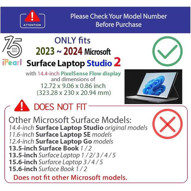 NOTE: Before placing order, PLEASE make sure to verify your laptop model number as this case is MODEL specific and NOT interchangeable. Please note the new Surface Laptop Studio 2 is slightly wider and thicker than the original Surface Laptop Studio released between Sept. 2021 and Sept. 2023. ^^ NOT fitting other Microsoft tablets and laptops. NOT compatible with ANY other laptops as well. Please note the new Surface Laptop Studio 2 is slightly wider and thicker than the original Surface Laptop Studio released between Sept. 2021 and Sept. 2023. ^^ Made of high-quality translucent polycarbonate material, which is shatter-proof and will protect your 2023 - 2024 14.4 -inch Microsoft Surface Laptop Studio 2 all around. ^^ Designed to perfectly fit the 2023~2024 14.4 -inch Microsoft Surface Laptop Studio 2 and protect ALL corners.