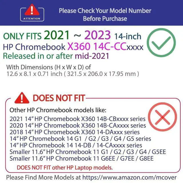 NOTE: Before placing order, PLEASE make sure to verify your laptop model number as this case is MODEL specific and NOT interchangeable. ^^ NOT fitting other HP Chromebook laptops. NOT compatible with ANY other HP laptops as well. ^^ Made of high-quality translucent polycarbonate material which is shatter-proof and will protect your 14" HP Chromebook x360 14C-CC0000 series Notebook Computer all around ^^ Designed to perfectly fit the 14" HP Chromebook x360 14C-CC0000 series Notebook Computer with dimension of 12.6 x 8.1 x 0.71 inch ( 321.5 x 206.0 x 17.95 mm ) ^^ 2-piece light-weight ( 8.1 oz or 230 g ) shell easily snaps on and off.