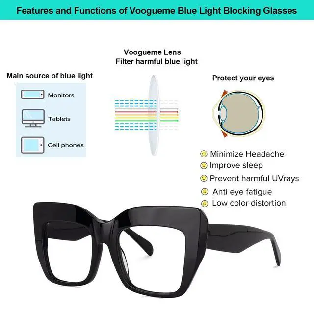 instruction: (1) Why do we need to filter blue light? Blue light from our computers, phones, tablets and other electronic products causes our eyes to not only work harder but puts them at risk of aging faster. By wearing blue light blocking glasses, you can limit the amount of blue light that enters your eyes and make your screentime more pleasant. Reduce eye strain, eye fatigue and sensitivity to light during computer term or any other digital time. Protect Your Eyes from macular degeneration and early vision loss, more concentrate on working and learning. Voogueme glasses are specially designed to filter out harmful blue light. Reduce the symptoms of digital eyestrainEyestrain, Headaches, sore or tired eyes, and stiff necks are all symptoms of digital eyestrain. Voogueme blue light blocking glasses make screen time more comfortable and help eliminate symptoms of digital eyestrain.