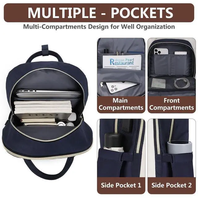 Large Capacity Backpack with Laptop Compartment- This big laptop backpack Total 4 compartments 26 pockets. The laptop compartment fit for 15.6 inch computer. The main compartment area holds A4 folders, work documents, clothes and other daily necessities. 3 front pockets for small items such as ipad, cell phones, Chargers, keys, pens, wallets etc. 2 sides pockets holds a 32oz water bottle and umbrella pretty well and more for a 3 day weekend. ^^ Convenient Luggage Strap & Anti-theft Design- Luggage strap on back of the computer backpacks allows backpack fit on luggage/suitcase, freeing your hands on a business trip.