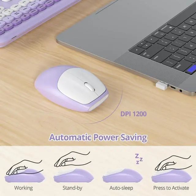 Auto-Sleep Mode: The purple wireless keyboard uses 1 AA battery, while the wireless cute mouse also requires 1 AA battery (included). Both devices enter auto-sleep mode after inactivity, optimizing battery usage for extended life ^^