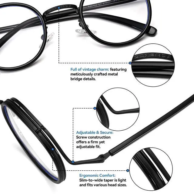 Fashion-Forward Retro Round DesignEmbrace a stylish and trendy look with our glasses, featuring a classic round circle shape inspired by retro steampunk aesthetics. This fashionable design is versatile for both men and women, easily pairing with casual, business, or travel outfits to elevate your personal style. ^^ Blue Light Blocking for Computer GlassesThese blue light blocking glasses are specifically engineered to filter harmful blue light and glare from computers, phones, and TV screens. Ideal for office workers, gamers, and students, they help reduce digital eye strain and protect eye health during extended device use.