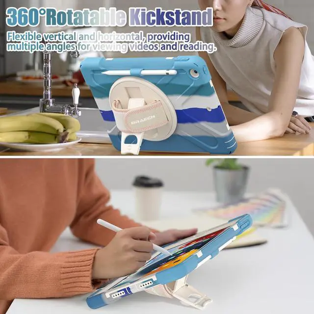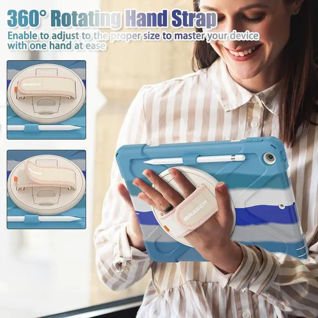 Adjustable Hand Strap: The Case for iPad 9th/8th/7th Generation Built-in kickstand for vertical & horizontal viewing (perfect for videos, reading, or meetings). Ergonomic hand strap fits all hand sizes (adults, kids, students) ^^