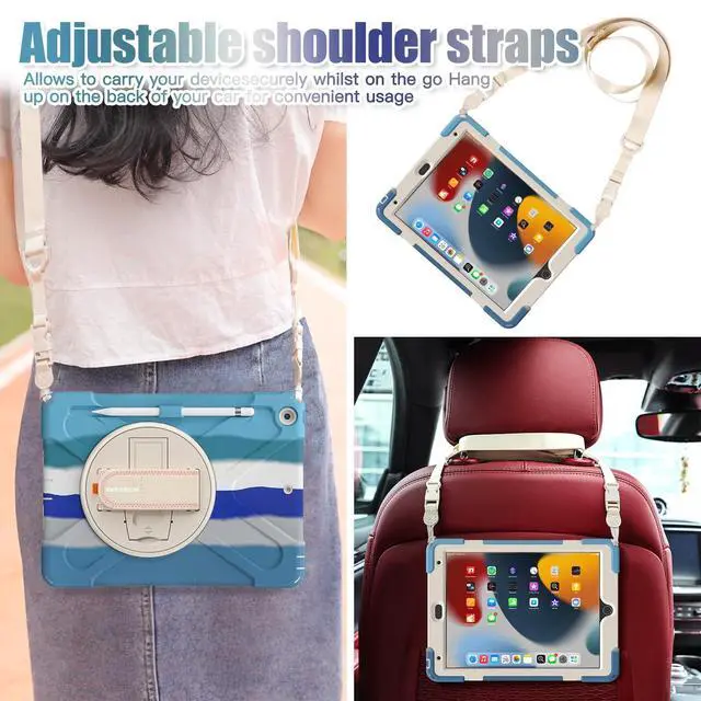 Detachable Multi-function Shoulder Strap: The iPad Case 9th/8th/7th Generation includes adjustable shoulder strap (59-inch) for cross-body/single-shoulder/car headrest mounting. Padded design reduces pressure during travel/commute ^^