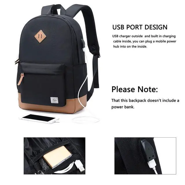 USB PORT DESIGN: The usb charging backpack with built in USB charger outside and built in charging cable inside, you can plug a mobile power hub into on the inside, then you just connect your usb cable to your backpack and plug in your device for easy charging. (Please noted that USB charging backpack doesn't power itsel and this backpack doesn't include a power bank. ) ^^ The backpacks perfects for traveling, weekend getaways, shopping & outdoor activities in daily life. Good gift for college High School big student for Boys, girls, teens, adults. 12-Month WARRANTY. Any quality problems with your bag, please contact us, we will solve it. (Recommended for children 3 years old and above. )