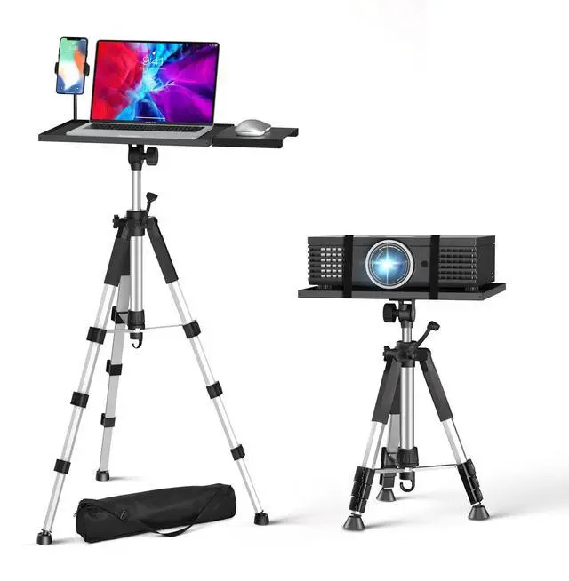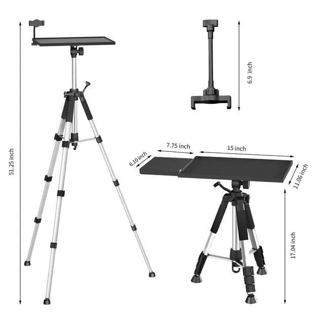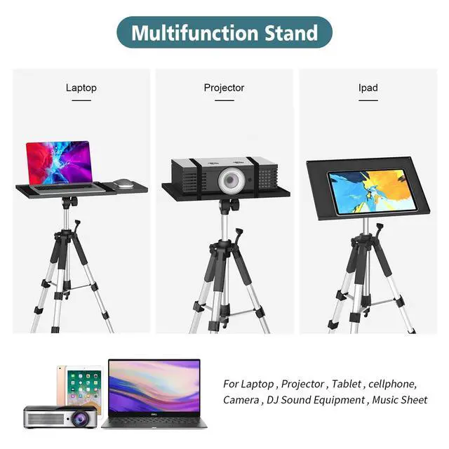 [ADJUSTABLE] The tripod for projector can easily set the height between 17.6 inches and 51.4 inches and it comes with a small gooseneck phone holder, you can adjust the angle of the plate, tripod projector stand give you a comfortable experience ^^ [STABLE] The projector tripod stand is more stable than the bottom tripod bracket. A hook is reserved at the bottom to hang proper weights to make it more stable ^^ [MULTIFUNCTIONAL] The size of the plate of laptop stand tripod is 14.9" x 11", the portable projector stand can be used for projector, laptop, DJ and so on, suit for various scenarios, like home theater, conference, speech, report, DJ, office ^^ [NO SLIP] The stand for projector is equipped with a non-slip mat and two elastic fixing straps.