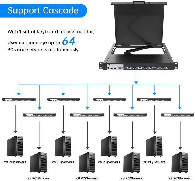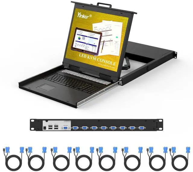 Yinker 8 Port VGA KVM Switch, with integrated 19 inch LCD monitor, US keyboard and touchpad, allows manage and control 8 computers or servers. ^^ [OSD/Hotkey/Panel Button] This LCD KVM console Support switching by the OSD menu, Hotkey and panel button. Support Daisy Chain/Cascade up to 64 computers. ^^ [Slide Drawer] Standard 1U Rackmountable Design and slide rails, allow installation to your preferred height. ^^ 19" LCD Monitor KVM Support up to 1280x1024@60Hz, compatible with Windows/Dos, Linux, Mac OS 8.6 /9/10.