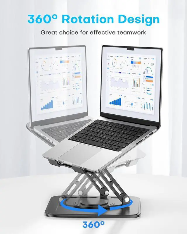 [Foldabe & Protable] - Foldable laptop stand for desk & Protable computer stand, It combines the advantages of market brackets, convenient travel laptop stand. Easy to use. Suitable for working at home, office and outdoor, improve comfort. ^^ [360Rotation] - The computer stand with 360 rotating base, 360 rotation connected with the base is more flexible, the computer stand allows you to rotate the laptop to any angle. ^^ [Stable & Durable] - The Computer stand is made of one-piece fiber metal material, which is more durable and stable than ordinary aluminum alloy computer stands.