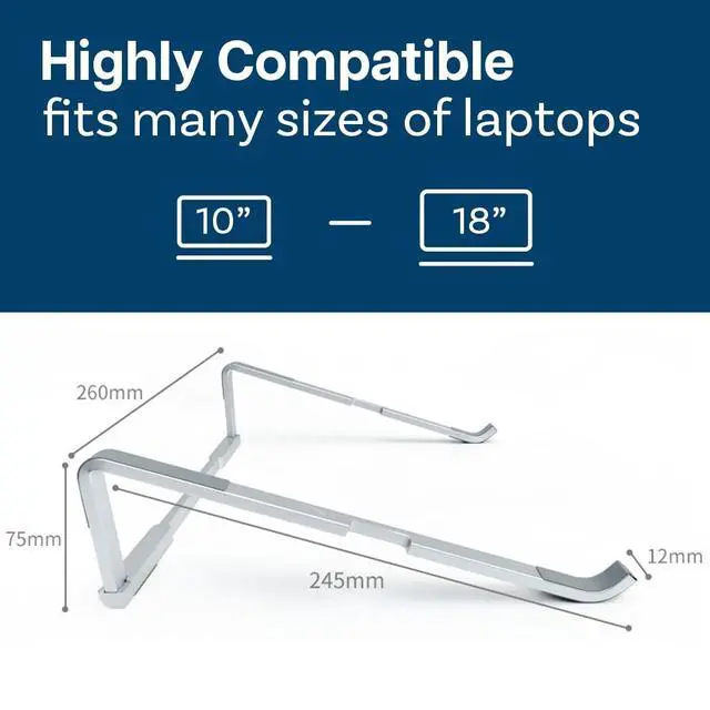 ^^ Compatibility - The laptop riser is suitable for all laptops between 10 and 18 inches. This makes the stand almost universally compatible with MacBook, Notebook, ASUS, Acer, Chromebook, HP, Dell, Lenovo and many more laptop models. ^^ Stable Design - The laptop stand is made of high-quality aluminum alloy, making the stand both lightweight and rock-solid. Thanks to its open design, the laptop stand has good ventilation which reduces overheating of your laptop. Furthermore, the stand features non-slip sillicone pads that ensure your laptop remains stable and firmly in place.