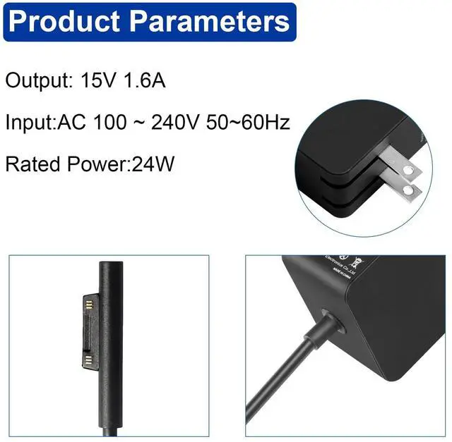 Output (DC): 15V- 1.6A 24W. 100% match with surface tables/laptops. ^^ Compatible with Microsoft Surface Go, compatible with Surface Pro 4 & Pro 3 & Pro 5 & Surface Laptop of Intel Core m3. ^^ Safety/UL Listed - Built-in protections against short circuiting, over-voltage, over-current, and overheating. ^^ 100% New Direct from Manufacturer. Buy with confidence! We have been manufacturing chargers for 11 years. To ensure our products fits as well as the original, our products include only the highest quality components.