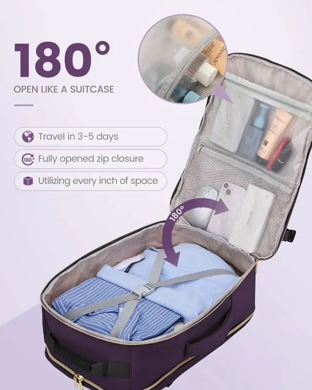 As Personal Item Airline Approved: The size of the carry on backpack is 18*14*8inch. Meets the maximum size allowed by most International Air Transport Association (IATA) flights, and can be placed in the overhead luggage compartment and under seat luggage for airlines, suitable for Spirit, Frontier, Easy Jet, Jet Blue, and other airlines. This travel backpack for women airline approved can be freely opened 90-180 degrees easily and quickly at the airport security check. ^^ With 3
