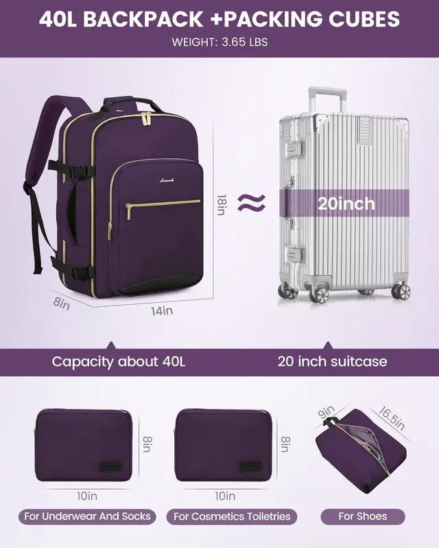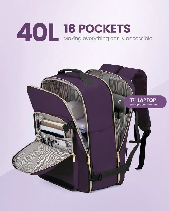 Large Capacity & Multiple Pockets: The travel backpack has a 40L large capacity and 4 main compartments, which can meet daily and travel needs. The travel backpack for women's main compartment can store a lot of things, including 5-8 pieces of clothing, shoes, books, and many other items. The separate laptop compartment is padded with EVA foam to provide the best protection for your 17" laptop and 12.9" iPad. The front compartment has many pockets to keep your belongings organized. ^^
