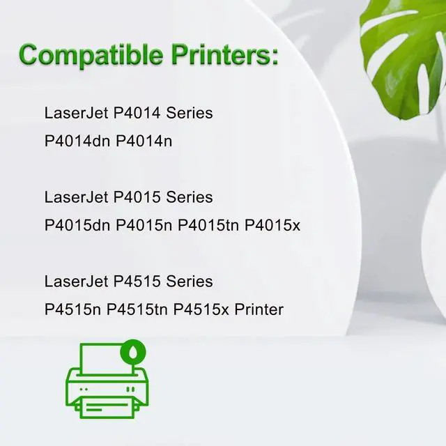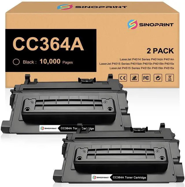 Printer CompatibilityThese cartridges are fully compatible for HP LaserJet P4014 Series P4014dn P4014n, LaserJet P4015 Series P4015dn P4015n P4015tn P4015x, LaserJet P4515 Series P4515n P4515tn P4515x Printer. ^^ High Page Yield10, 000 pages per Black at 5% Coverage of letter/A4. ^^ Package Content2 packs black compatible toner cartridge replacement. ^^ High-quality TonerSINOPRINT cartridges can provide clear text and graphics, print the color effect you want on the paper, comparable to OEM cartridges. ^^ Good ServiceHigh-quality toner cartridges provide clear text and graphics, printing the color effect you want on the paper.