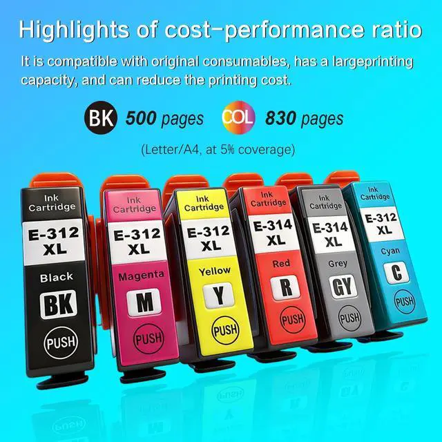 ^^ High printing volume: At a 5% A4 page coverage, the black cartridge yields 500 pages, while the cyan, magenta, yellow, red and gray cartridges each deliver 830 pages. Each 312XL/314XL cartridge has a capacity of 13.2 ml.