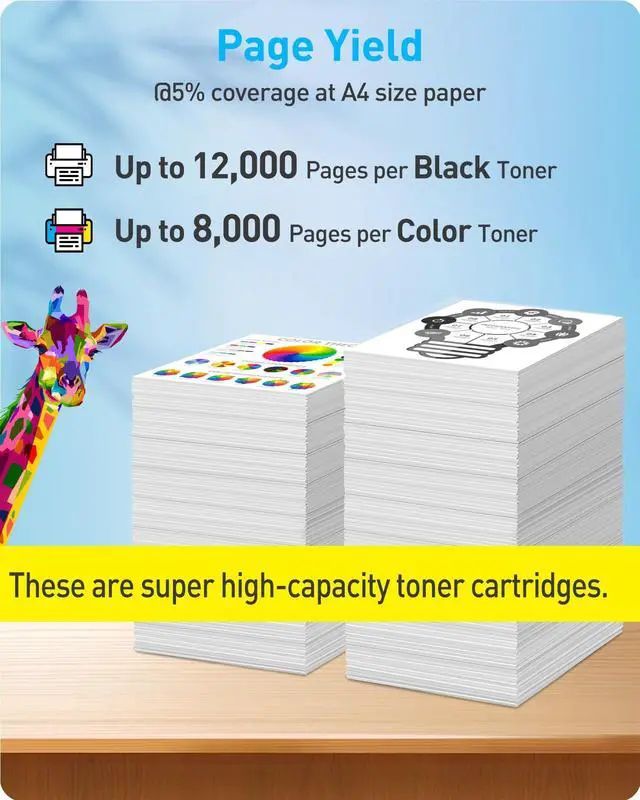 ^^ SUBSTANTIAL PAGE YIELD: Experience extended printing with a high-capacity black toner yielding up to 12, 000 pages and color toners (cyan, magenta, yellow) each yielding up to 8, 000 pages, based on 5% page coverage on A4-size paper.
